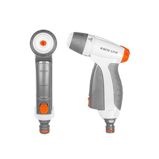 Bradas White Line WL-EN51M locsolópisztoly. Tartós, formatartó fém váz. A vízsugár állítható az erős vízáramtól a finom ködig. A teljesítmény szabályozható. A kar blokkolóval van felszerelve, ami megakadályozza a nagyobb felületek öntözésekor a kéz elfáradását..