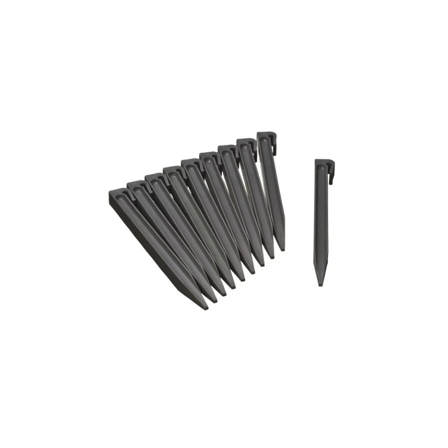 Újrahasznosított polipropilénből készült rögzítőtüskék, használható a 15cm-es polipropilén szegélyek rögzítésére. A rögzítőtüskék a szegély tetejére rögzíthetők.