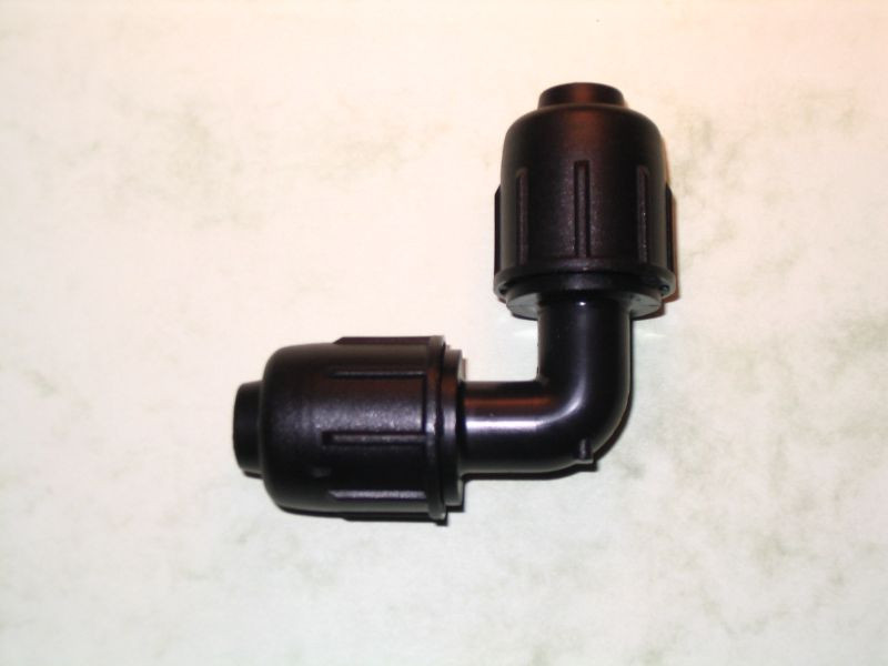Könyökidom 16mm-es, LP csövekhez és csepegtető csövekhez.